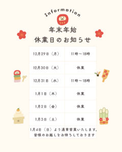 年末年始のお知らせ 投稿公開日:2025年12月26日 投稿カテゴリー:お知らせ こんにちは♪ 森のヘッドスパです! 年末年始のおしらせです。遅い告知となり大変申し訳ございません。。。 今年もたくさんのお客様に支えられて、とても充実した一年となりました。 今年も残り1週間を切りましたが、おもてなし120%!!全力で駆け抜けたいと思います🏃♀️💨 来年も皆様にとって素晴らしい一年になりますように^^ おすすめ オープンいたしました! 2022年5月5日 森のヘッドスパ ホームページを公開致しました。 2022年4月23日 【求人のご案内】 2025年12月22日